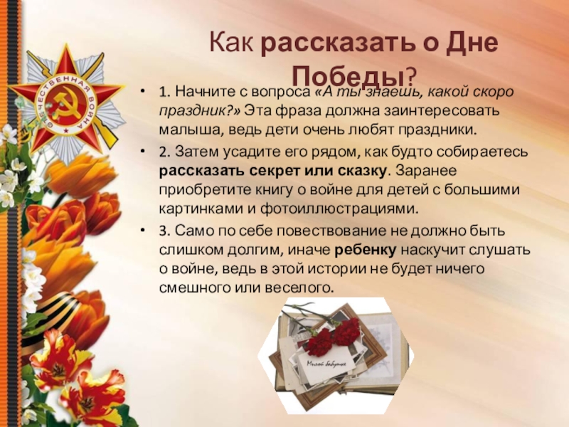 3. Само по себе повествование не должно быть слишком долгим, иначе ребенку наскучит слушать о войне, ведь в этой истории не будет ничего смешного или веселого.
