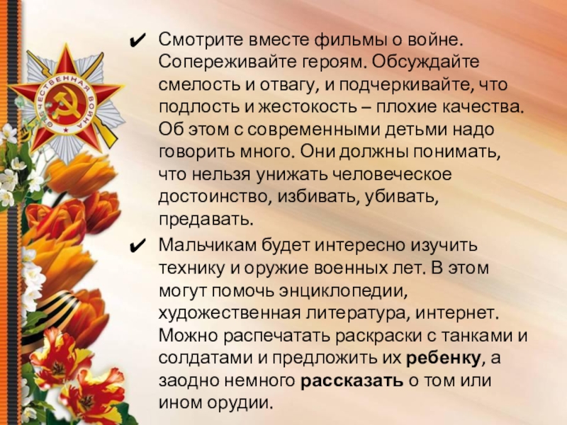 Слайд 7Смотрите вместе фильмы о войне. Сопереживайте героям. Обсуждайте смелость и