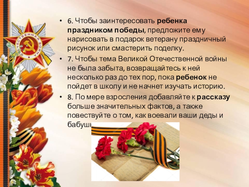 Слайд 46. Чтобы заинтересовать ребенка праздником победы, предложите ему нарисовать в