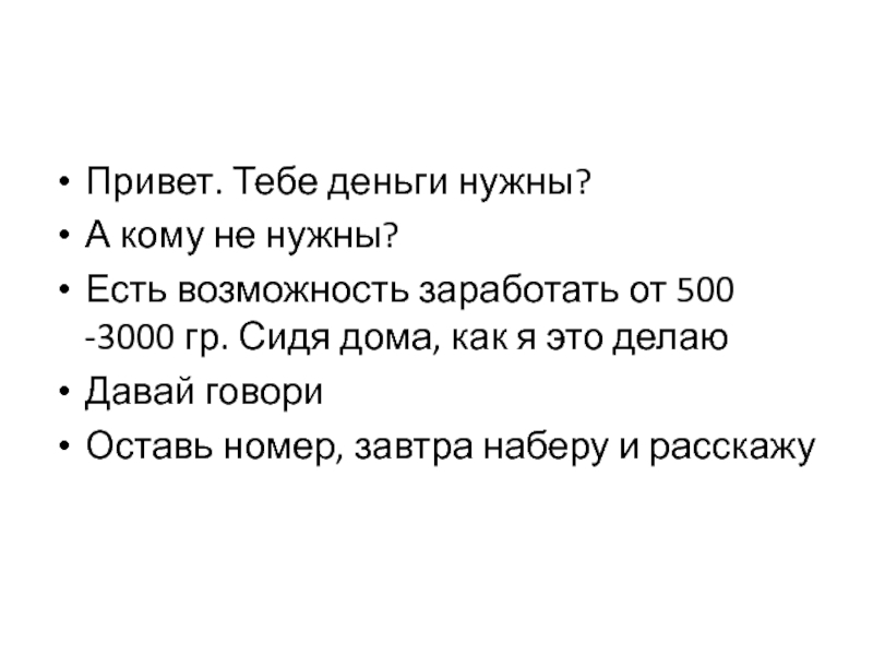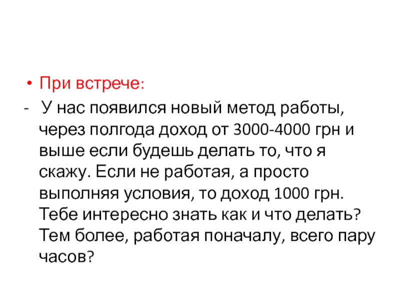 то, что я скажу. Если не работая, а просто выполняя условия, то доход 1000 грн. Тебе интересно знать как и что делать? Тем более, работая поначалу, всего пару часов?