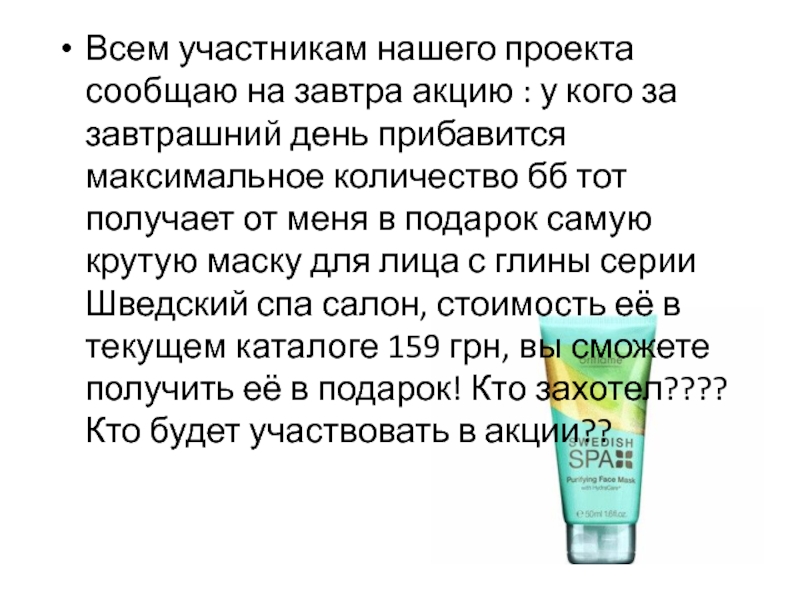 от меня в подарок самую крутую маску для лица с глины серии Шведский спа салон, стоимость её в текущем каталоге 159 грн, вы сможете получить её в подарок! Кто захотел????Кто будет участвовать в акции??