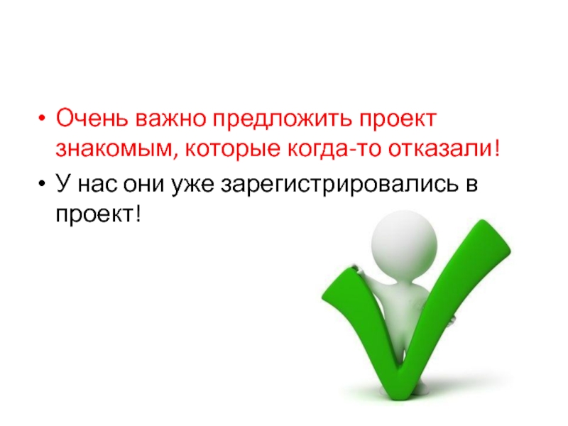 Слайд 19Очень важно предложить проект знакомым, которые когда-то отказали!