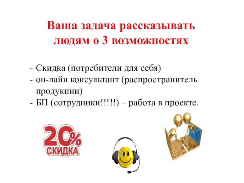 Слайд 27Ваша задача рассказывать людям о 3 возможностях