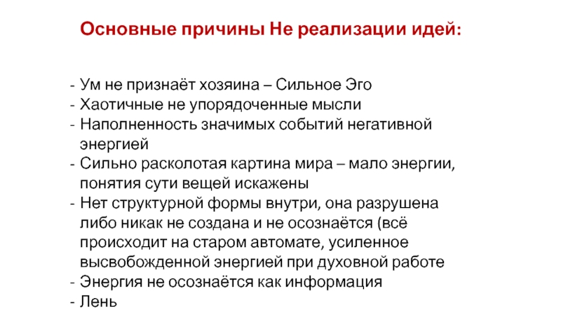 Основные причины Не реализации идей:Ум не признаёт хозяина – Сильное ЭгоХаотичные не упорядоченные мыслиНаполненность значимых событий негативной