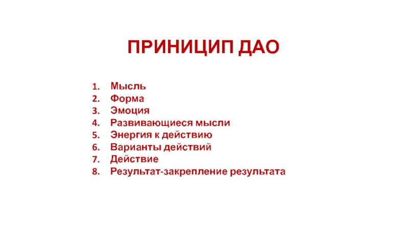 ПРИНИЦИП ДАОМысль ФормаЭмоцияРазвивающиеся мыслиЭнергия к действиюВарианты действийДействиеРезультат-закрепление результата