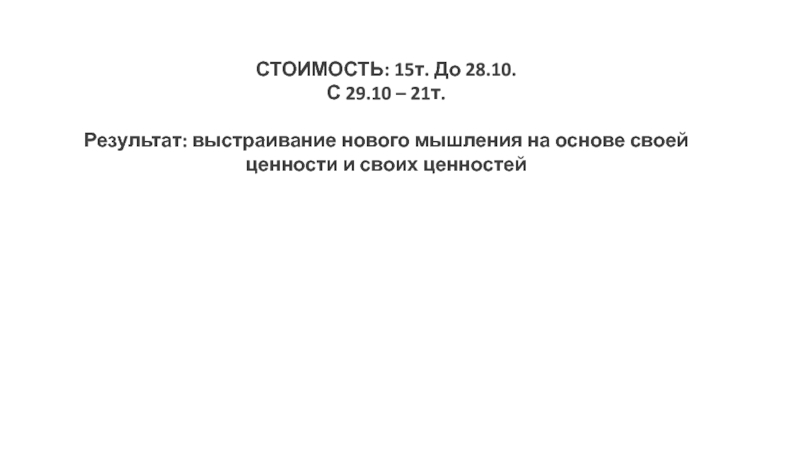 СТОИМОСТЬ: 15т. До 28.10.С 29.10 – 21т.Результат: выстраивание нового мышления на основе своей ценности и своих ценностей