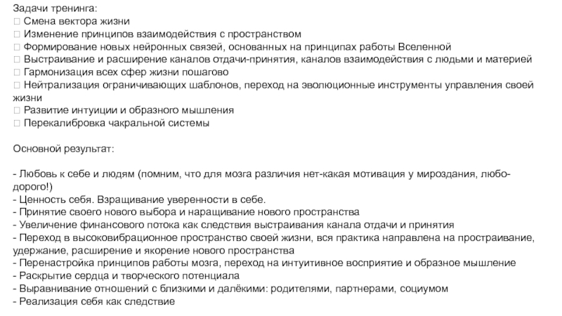 и расширение каналов отдачи-принятия, каналов взаимодействия с людьми и материей  Гармонизация всех сфер жизни пошагово  Нейтрализация ограничивающих шаблонов, переход на эволюционные инструменты управления своей жизни  Развитие интуиции и образного мышления  Перекалибровка чакральной системы Основной результат: - Любовь к себе и людям (помним, что для мозга различия нет-какая мотивация у мироздания, любо-дорого!) - Ценность себя. Взращивание уверенности в себе. - Принятие своего нового выбора и наращивание нового пространства - Увеличение финансового потока как следствия выстраивания канала отдачи и принятия - Переход в высоковибрационное пространство своей жизни, вся практика направлена на простраивание, удержание, расширение и якорение нового пространства - Перенастройка принципов работы мозга, переход на интуитивное восприятие и образное мышление - Раскрытие сердца и творческого потенциала - Выравнивание отношений с близкими и далёкими: родителями, партнерами, социумом - Реализация себя как следствие