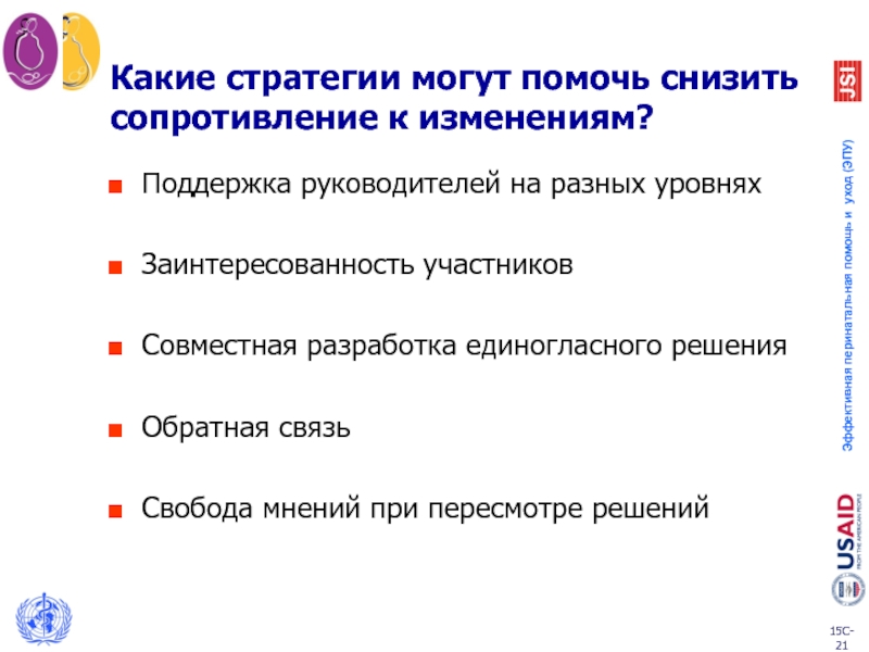 Слайд 21Какие стратегии могут помочь снизить сопротивление к изменениям?