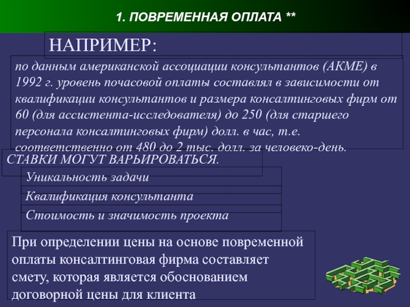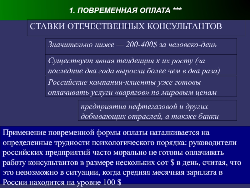 Применение повременной формы оплаты наталкивается на определенные трудности психологического порядка: руководители российских предприятий часто морально не готовы оплачивать работу консультантов в размере нескольких сот $ в день, считая, что это невозможно в ситуации, когда средняя месячная зарплата в России находится на уровне 100 $