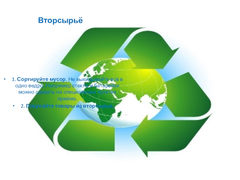 Вторсырьё1. Сортируйте мусор. Не выкидывайте всё в одно ведро. Например стекло и батарейки можно сдавать на специальных