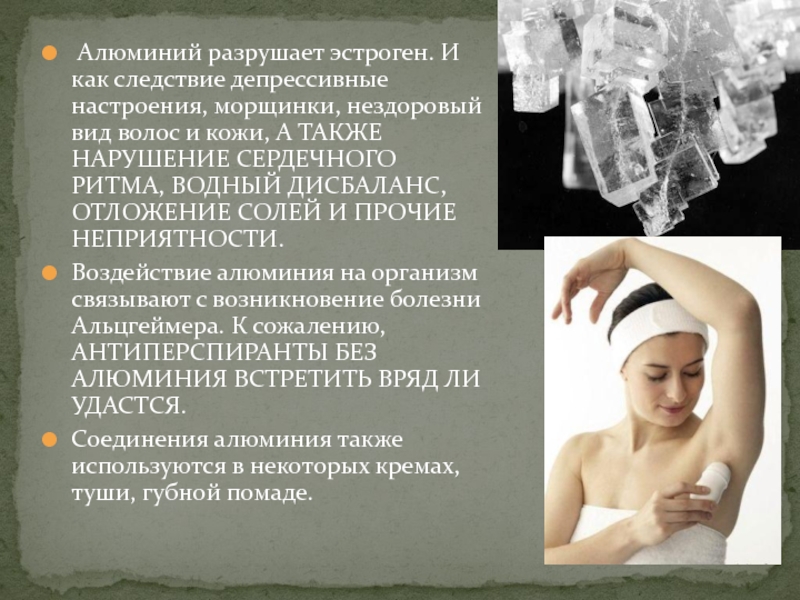 Слайд 11 Алюминий разрушает эстроген. И как следствие депрессивные настроения, морщинки,