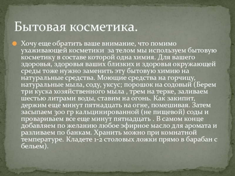 Вы, дорогие мои слушатели, перейдете с химических средств, вредящих Вашему здоровью и здоровью окружающей среды, на натуральную домашнюю. В наше время человечество стремительно теряет свое здоровье, также состояние экологии у нас не самое лучшее… И пора бы задуматься над всем этим, начать с малого и дойти до великого! Ради себя, близких и будущего поколения!
