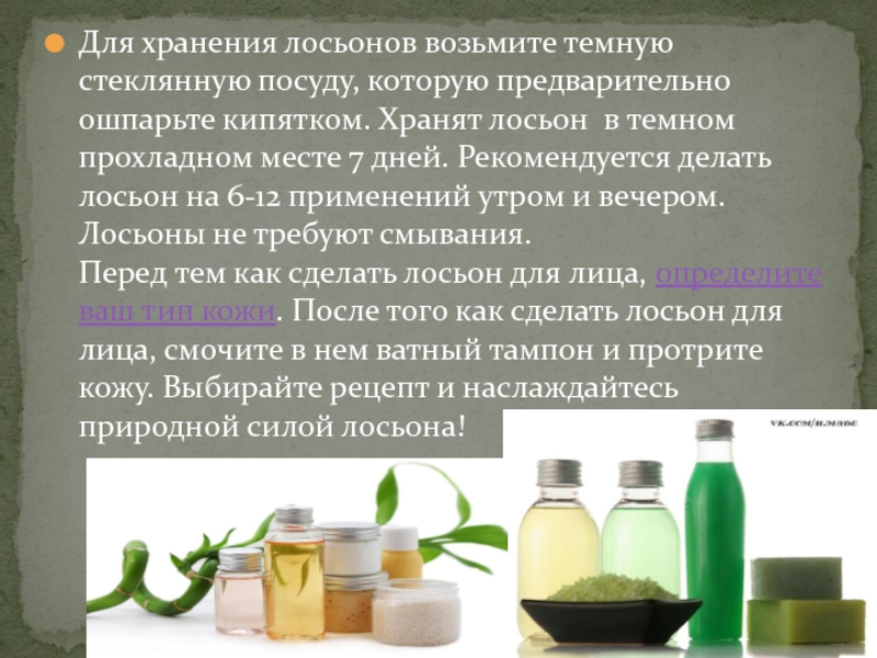 Слайд 27Для хранения лосьонов возьмите темную стеклянную посуду, которую предварительно ошпарьте
