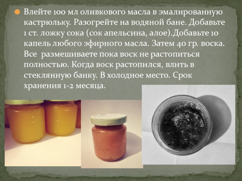 Слайд 35Влейте 100 мл оливкового масла в эмалированную кастрюльку. Разогрейте на