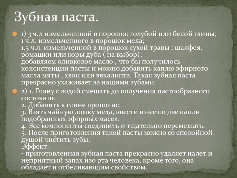 добавляем оливковое масло , что бы получилось консистенции пасты и можно добавить каплю эфирного масла мяты , хвои или эвкалипта. Такая зубная паста прекрасно ухаживает за нашими зубами.