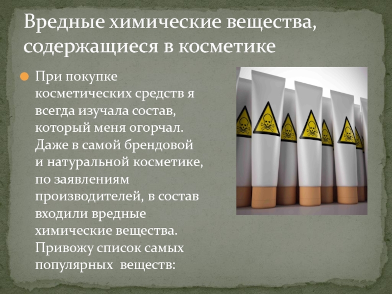 Слайд 5При покупке косметических средств я всегда изучала состав, который меня