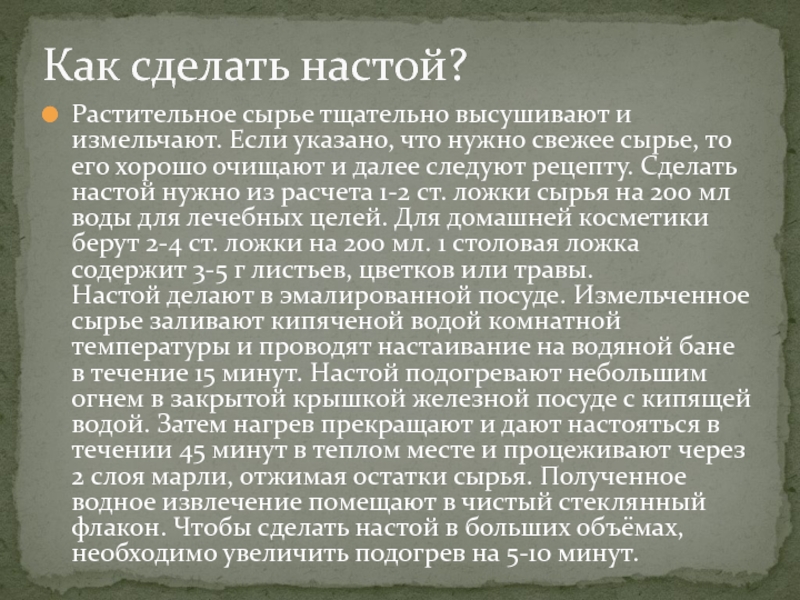 Слайд 28Растительное сырье тщательно высушивают и измельчают. Если указано, что нужно