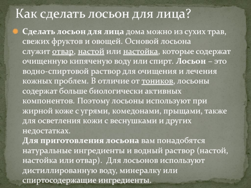 и овощей. Основой лосьона служит отвар, настой или настойка, которые содержат очищенную кипяченую воду