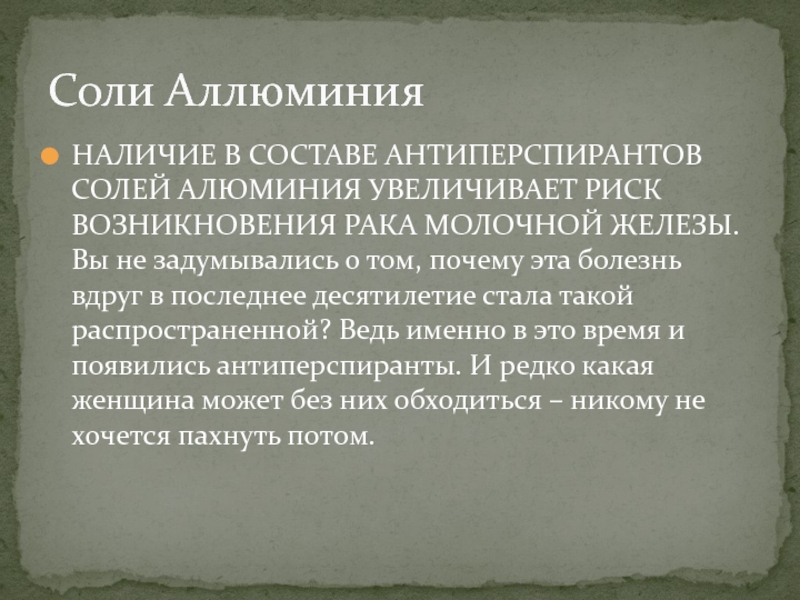 Слайд 10НАЛИЧИЕ В СОСТАВЕ АНТИПЕРСПИРАНТОВ СОЛЕЙ АЛЮМИНИЯ УВЕЛИЧИВАЕТ РИСК ВОЗНИКНОВЕНИЯ РАКА