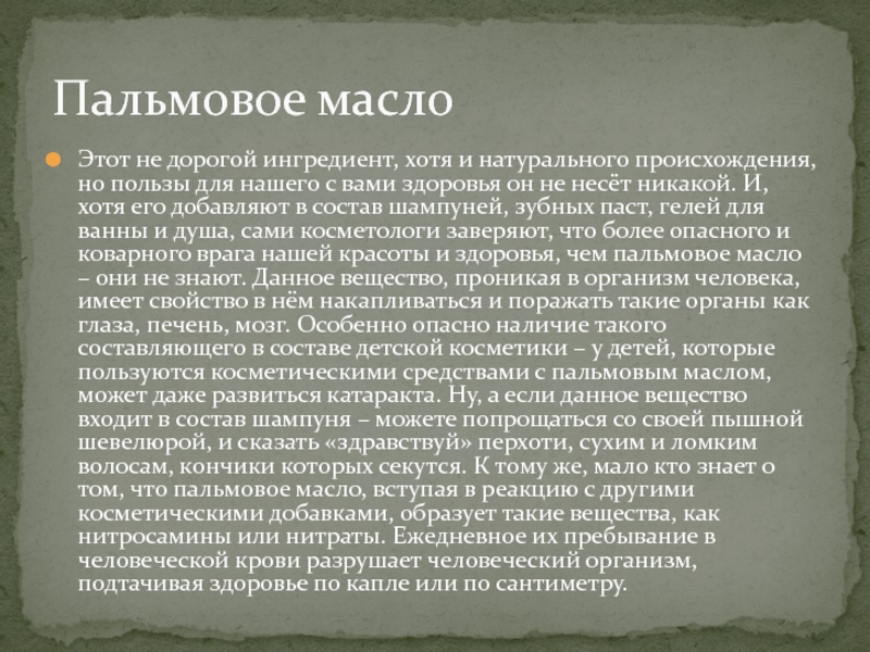 хотя его добавляют в состав шампуней, зубных паст, гелей для ванны и душа, сами косметологи заверяют, что более опасного и коварного врага нашей красоты и здоровья, чем пальмовое масло – они не знают. Данное вещество, проникая в организм человека, имеет свойство в нём накапливаться и поражать такие органы как глаза, печень, мозг. Особенно опасно наличие такого составляющего в составе детской косметики – у детей, которые пользуются косметическими средствами с пальмовым маслом, может даже развиться катаракта. Ну, а если данное вещество входит в состав шампуня – можете попрощаться со своей пышной шевелюрой, и сказать «здравствуй» перхоти, сухим и ломким волосам, кончики которых секутся. К тому же, мало кто знает о том, что пальмовое масло, вступая в реакцию с другими косметическими добавками, образует такие вещества, как нитросамины или нитраты. Ежедневное их пребывание в человеческой крови разрушает человеческий организм, подтачивая здоровье по капле или по сантиметру.