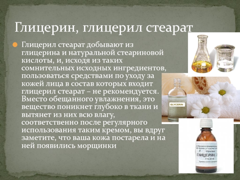 Слайд 9Глицерил стеарат добывают из глицерина и натуральной стеариновой кислоты, и,