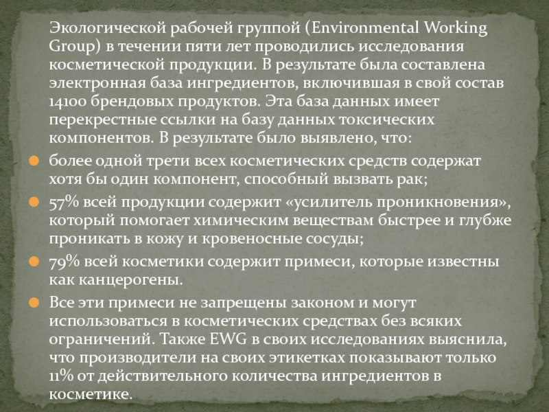 Слайд 4 Экологической рабочей группой (Environmental Working Group) в течении