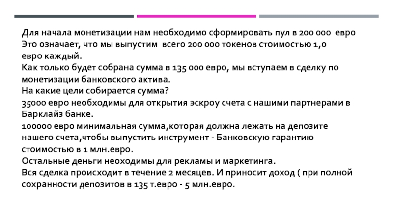 Выпущено токенов будет очень ограниченное количество, необходимое нам для того,чтобы войти в банковскую сделку.Эту сделку мы осуществляем с нашими надежными партнерами, с которыми в дальнейшем будем делать Частное размещение.