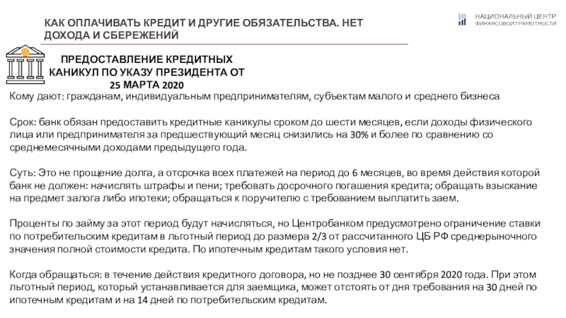 ПРЕДОСТАВЛЕНИЕ КРЕДИТНЫХ КАНИКУЛ ПО УКАЗУ ПРЕЗИДЕНТА ОТ 25 МАРТА 2020