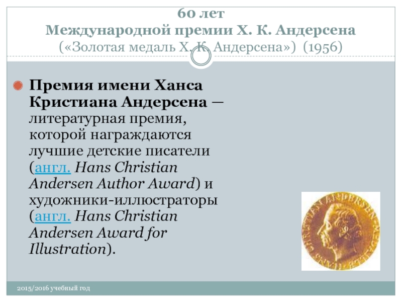 литературная премия, которой награждаются лучшие детские писатели (англ. Hans Christian Andersen Author Award) и художники-иллюстраторы (англ. Hans Christian Andersen Award for Illustration).