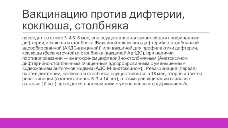 коклюшно-дифтерийно-столбнячной адсорбированной (АКДС-вакциной)] или вакциной для профилактики дифтерии, коклюша (бесклеточной) и столбняка (вакциной АаКДС), при наличии противопоказаний — анатоксином дифтерийно-столбнячным [Анатоксином дифтерийно-столбнячным очищенным адсорбированным с уменьшенным содержанием антигенов жидким (АДС-М-анатоксином)]. Ревакцинация (первая) против дифтерии, коклюша и столбняка осуществляется в 18 мес, вторая и третья ревакцинации (соответственно 6–7 и 14 лет), а также ревакцинации взрослых (каждые 10 лет) проводятся анатоксинами с уменьшенным содержанием Аг.