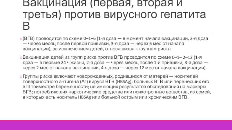 Слайд 5Вакцинация (первая, вторая и третья) против вирусного гепатита В
