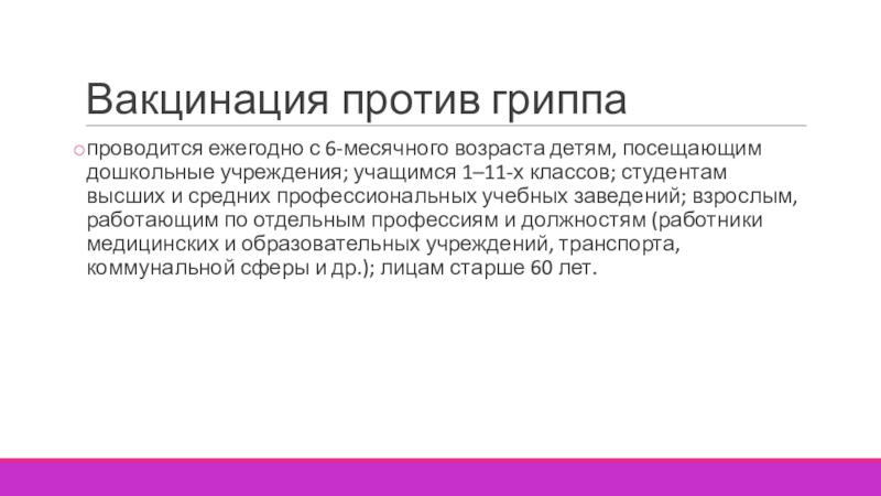 учебных заведений; взрослым, работающим по отдельным профессиям и должностям (работники медицинских и образовательных учреждений, транспорта, коммунальной сферы и др.); лицам старше 60 лет.