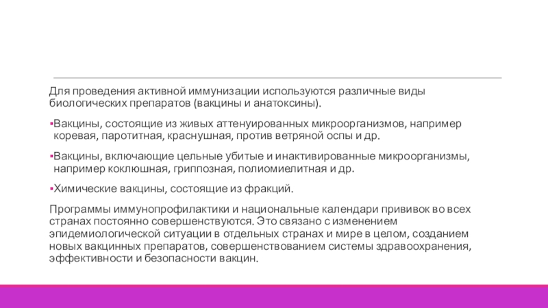 Слайд 3Для проведения активной иммунизации используются различные виды биологических препаратов (вакцины