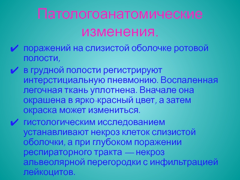 гистологическим исследованием устанавливают некроз клеток слизистой оболочки, а при глубоком поражении респираторного тракта — некроз альвеолярной перегородки с инфильтрацией лейкоцитов.