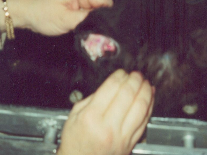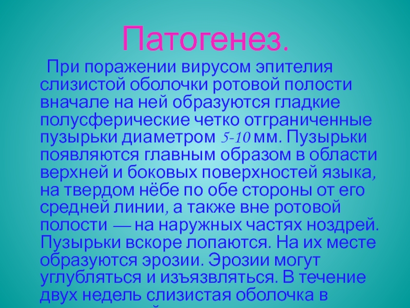 пузырьки диаметром 5-10 мм. Пузырьки появляются главным образом в области верхней и боковых поверхностей языка, на твердом нёбе по обе стороны от его средней линии, а также вне ротовой полости — на наружных частях ноздрей. Пузырьки вскоре лопаются. На их месте образуются эрозии. Эрозии могут углубляться и изъязвляться. В течение двух недель слизистая оболочка в местах эрозий регенерирует.