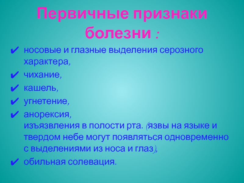Слайд 14Первичные признаки болезни :