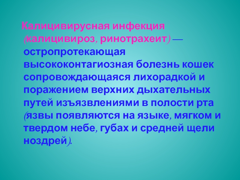 Слайд 3 Калицивирусная инфекция (калицивироз, ринотрахеит) — остропротекающая высококонтагиозная болезнь