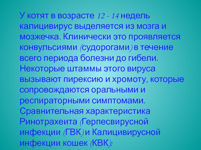 калицивирус выделяется из мозга и мозжечка. Клинически это проявляется конвульсиями