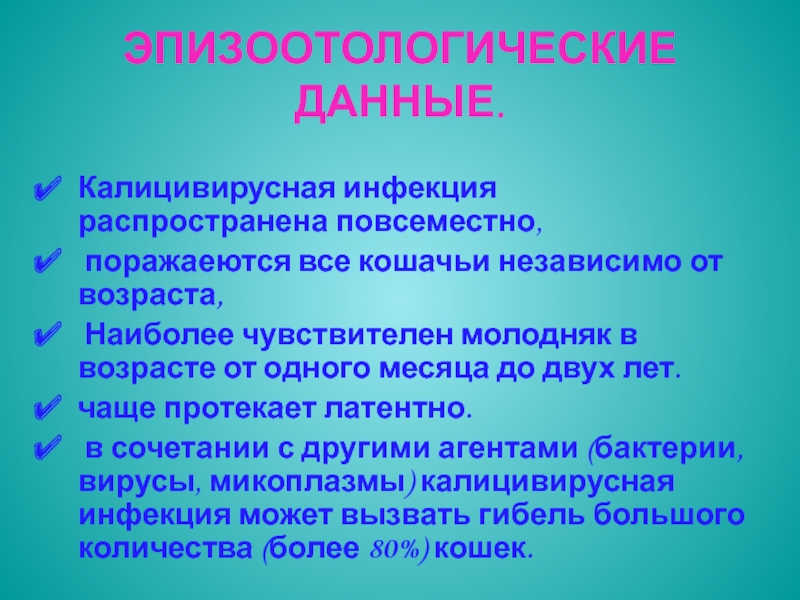 в сочетании с другими агентами (бактерии, вирусы, микоплазмы) калицивирусная инфекция может вызвать гибель большого количества (более 80%) кошек.