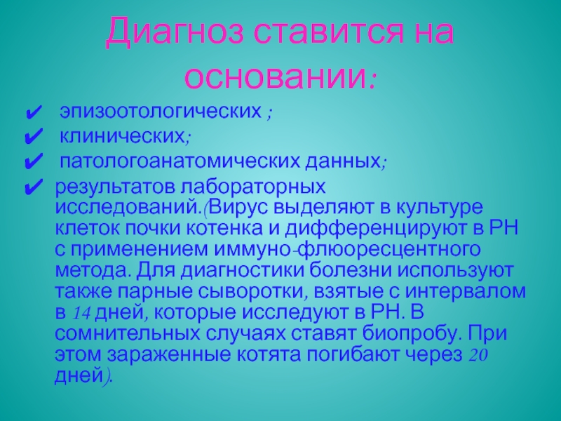 РН с применением иммуно-флюоресцентного метода. Для диагностики болезни используют также парные сыворотки, взятые с интервалом в 14 дней, которые исследуют в РН. В сомнительных случаях ставят биопробу. При этом зараженные котята погибают через 20 дней).
