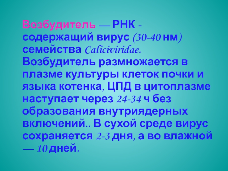 языка котенка, ЦПД в цитоплазме наступает через 24-34 ч без образования внутриядерных включений.. В сухой среде вирус сохраняется 2-3 дня, а во влажной — 10 дней.
