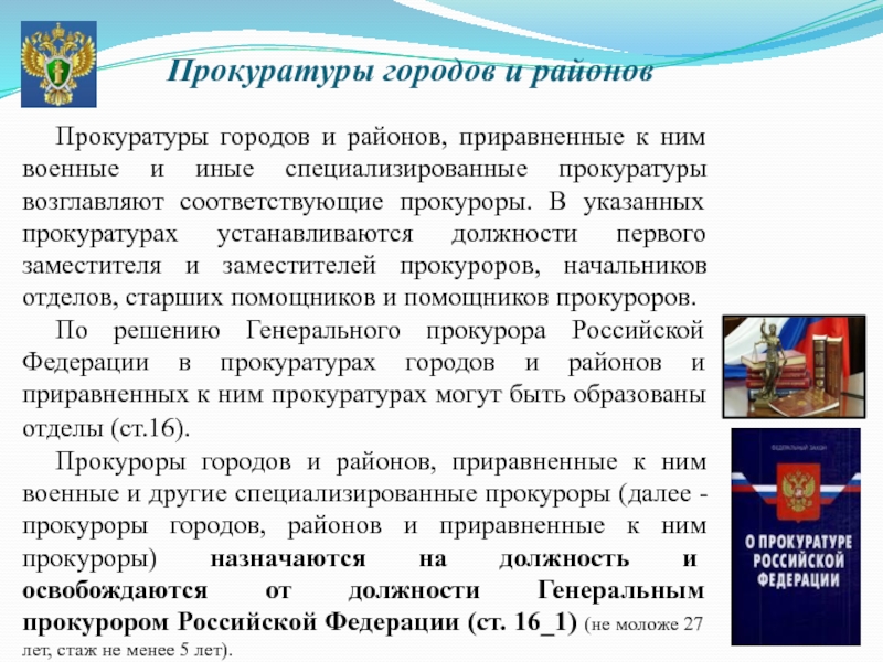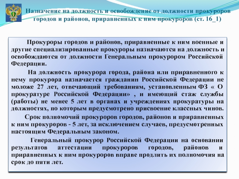 На должность прокурора города, района или приравненного к нему прокурора назначается гражданин Российской Федерации не моложе 27 лет, отвечающий требованиям, установленным ФЗ « О прокуратуре Российской Федерации» , и имеющий стаж службы (работы) не менее 5 лет в органах и учреждениях прокуратуры на должностях, по которым предусмотрено присвоение классных чинов.