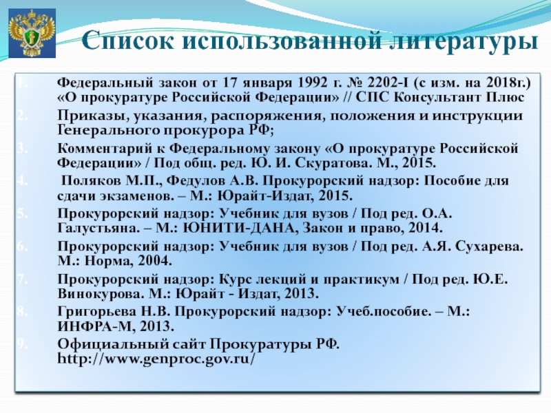 Прокурорский надзор: Учебник для вузов / Под ред. О.А. Галустьяна. – М.: ЮНИТИ-ДАНА, Закон и право, 2014.