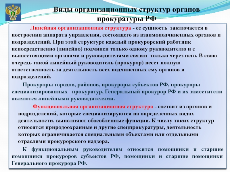 взаимоподчиненных органов и подразделений. При этой структуре каждый прокурорский работник непосредственно (линейно) подчинен только одному руководителю и с вышестоящими органами и руководителями связан только через него. В свою очередь такой линейный руководитель (прокурор) несет полную ответственность за деятельность всех подчиненных ему органов и подразделений.