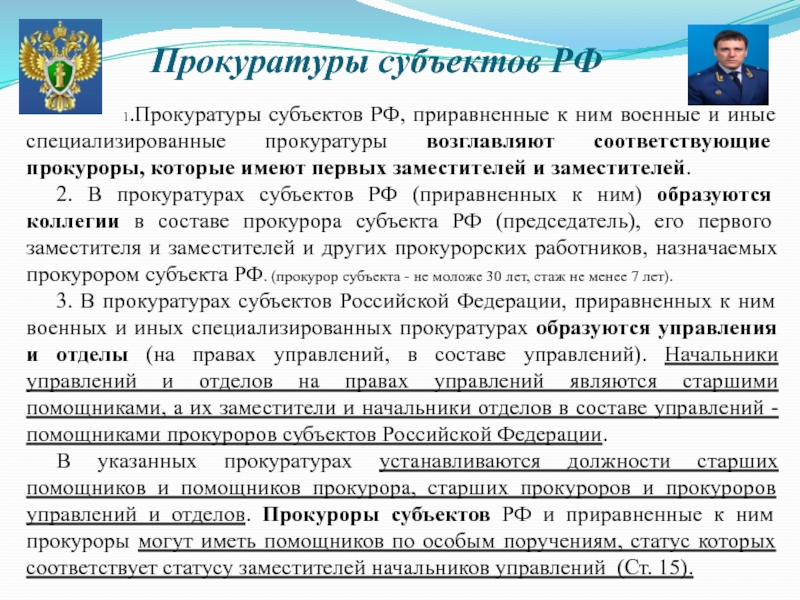 На должность прокурора субъекта РФ или прокурора, приравненного к прокурору субъекта РФ, назначается гражданин Российской Федерации не моложе 30 лет, отвечающий требованиям закона «О прокуратуре РФ» , и имеющий стаж службы (работы) не менее 7 лет в органах и учреждениях прокуратуры на должностях, по которым предусмотрено присвоение классных чинов. Срок полномочий прокуроров субъектов Российской Федерации - пять лет.