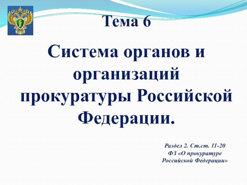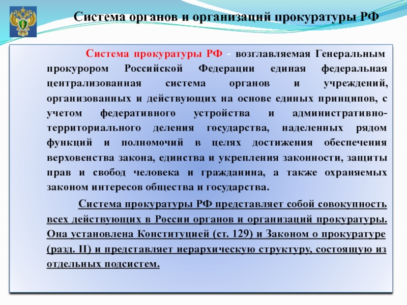 Система прокуратуры РФ представляет собой совокупность всех действующих в России органов и организаций прокуратуры. Она установлена Конституцией (ст. 129) и Законом о прокуратуре (разд. II) и представляет иерархическую структуру, состоящую из отдельных подсистем.