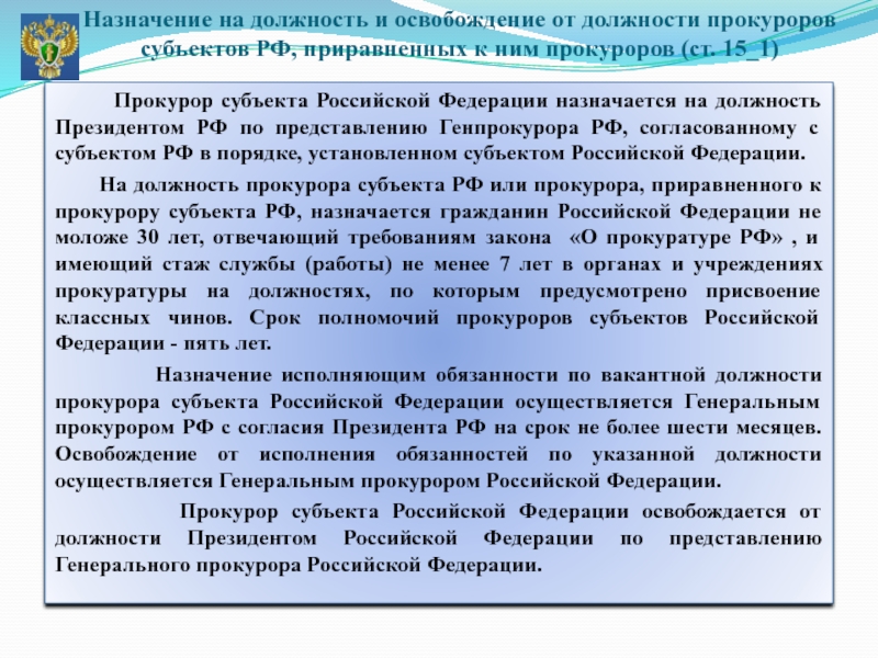 Назначение на должность и освобождение от должности прокуроров субъектов РФ, приравненных к ним прокуроров (ст. 15_1)