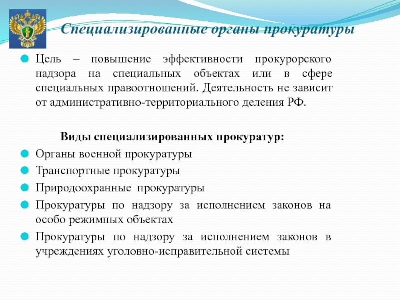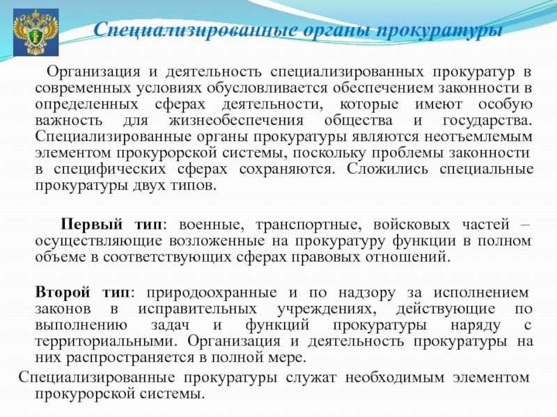 3. Специализированные органы прокуратуры. (Военные, транспортные, природоохранные, прокуратуры ЗАТО и на особо режимных объектах, по надзору за исполнением законов в исправительных учреждениях)