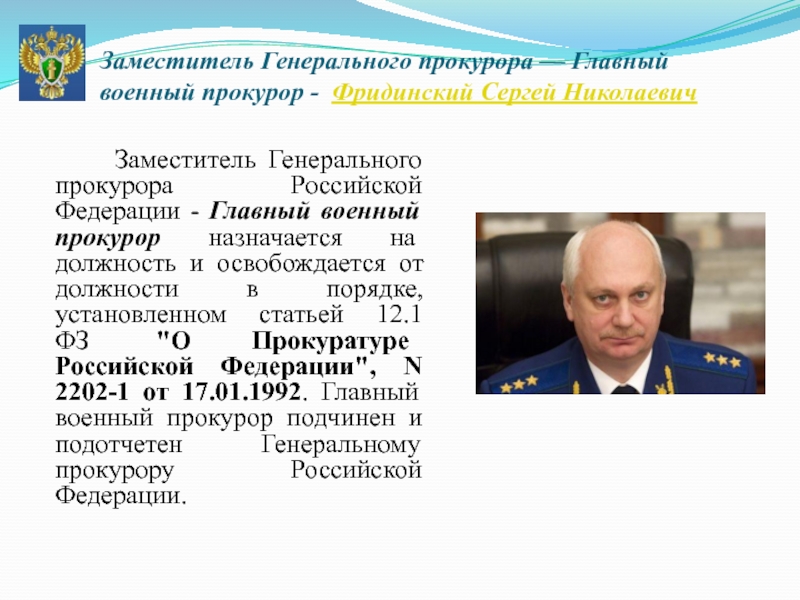 Слайд 14Заместитель Генерального прокурора — Главный военный прокурор - Фридинский Сергей