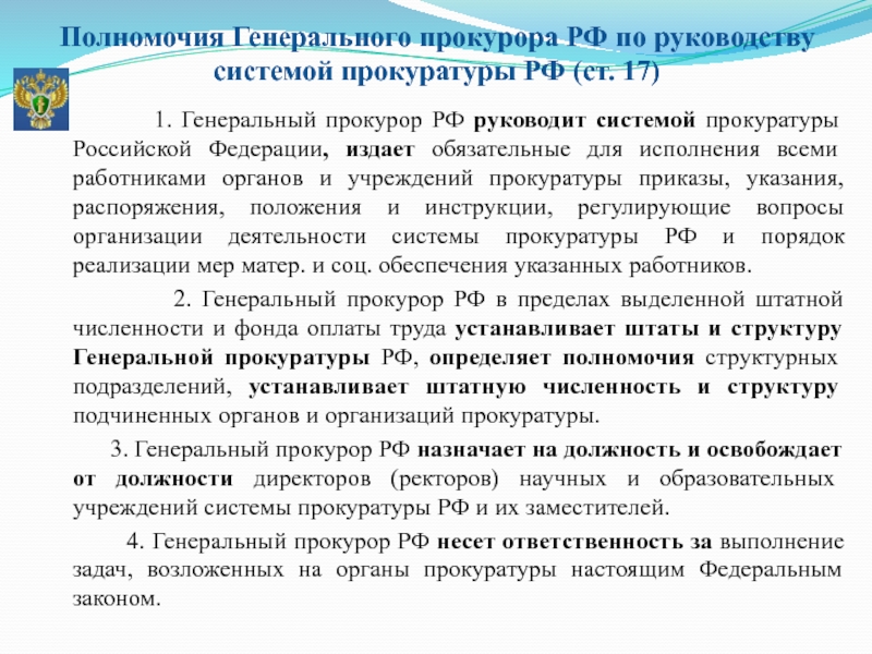 РФ руководит системой прокуратуры Российской Федерации, издает обязательные для исполнения всеми работниками органов и учреждений прокуратуры приказы, указания, распоряжения, положения и инструкции, регулирующие вопросы организации деятельности системы прокуратуры РФ и порядок реализации мер матер. и соц. обеспечения указанных работников.